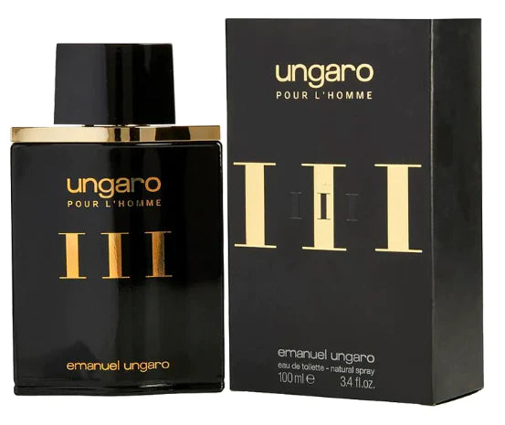 Ungaro pour L'Homme III de Emanuel Ungaro es una fragancia de la familia olfativa Aromática Verde para Hombres. Las Notas de Salida son naranja, caoba, cilantro, lavanda, vodka, salvia y limón (lima ácida); las Notas de Corazón son jazmín, lirio de los valles (muguete), rosa y geranio; las Notas de Fondo son sándalo, pachulí, almizcle, musgo de roble, vetiver y cedro.