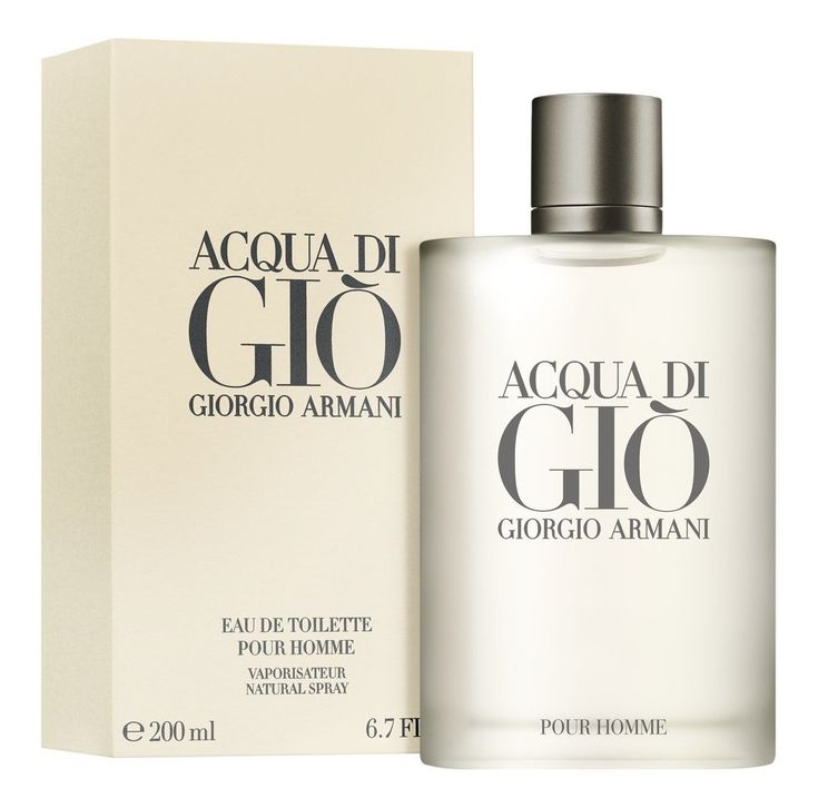 Acqua di Gio de Giorgio Armani es una fragancia de la familia olfativa Aromática Acuática para Hombres. Las Notas de Salida son naranja, lima (limón verde), mandarina, jazmín, bergamota, limón (lima ácida) y neroli; las Notas de Corazón son ciclamen (violeta persa), nuez moscada, reseda (miñoneta), cilantro, violeta, fresia, notas marinas, durazno (melocotón), jacinto, rosa, jazmín, romero y calone; las Notas de Fondo son ámbar, pachulí, musgo de roble, cedro y almizcle blanco.
