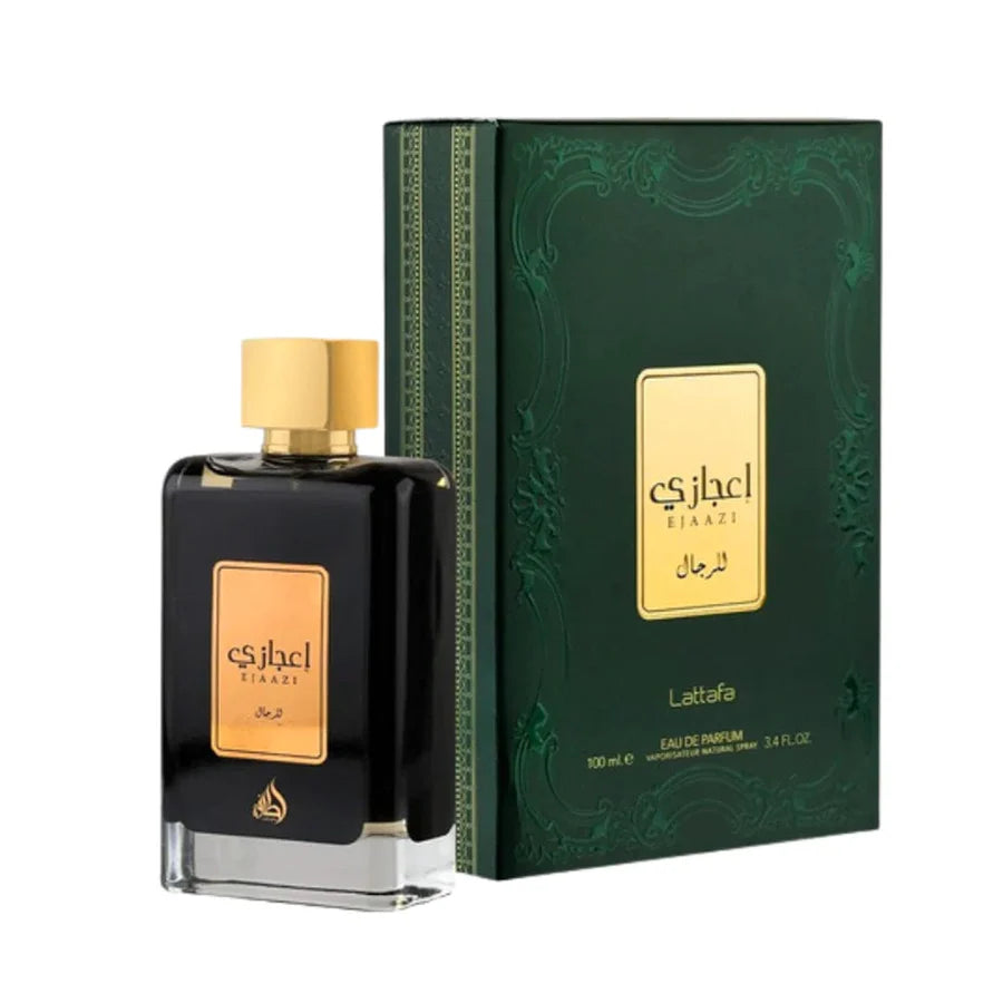 Ejaazi de Lattafa Perfumes es una fragancia de la familia olfativa Aromática Frutal para Hombres y Mujeres. Ejaazi se lanzó en 2021. Las Notas de Salida son mandarina y pomelo; las Notas de Corazón son cedro y notas marinas; las Notas de Fondo son ámbar y musgo.
